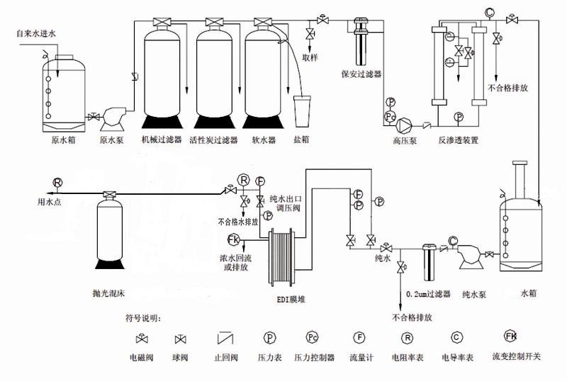 一種新的去離子水處理方法。又稱連續電除鹽技術,EDI裝置將離子交換樹脂充夾在陰/陽離子交換膜之間形成EDI單元。這種方法不需再用酸堿對樹脂進行再生,環保性好